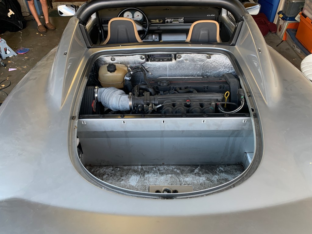 Image of original Lotus with rear clamshell with ICU still in the car with all pistons visible, demonstrating how much space it took up.