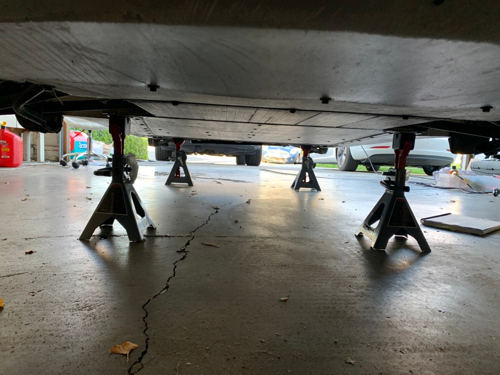 When we started our preparation phase, we began to mount the Lotus on stands so that we could completely remove every part from the system without it falling over. As you can see from the picture below, the car was mounted with four of these stands, allowing us to completely remove the wheels. All done in our garage.
